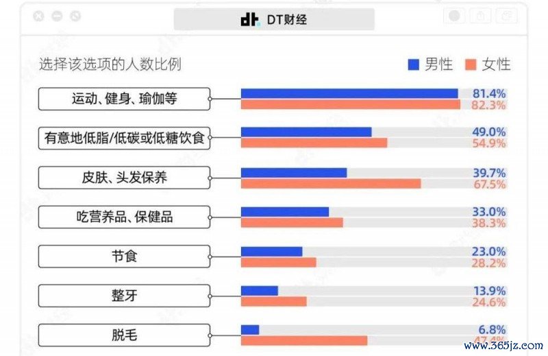 根据DT财经发布的一项关于《当代青年身体观小调研》显示,排名前五的身体焦虑分别是:体态焦虑、体重焦虑、皮肤焦虑、健康焦虑和颜值焦虑。而在运动健身、克制饮食(避免高糖、高脂、高碳水)的问题上,男女几乎没有差别,有81.4%的男性和82.3%的女性选择“运动、健身、瑜伽”,有49%的男性和54.9%的女性选择“有意的低脂、低碳或低糖饮食”。