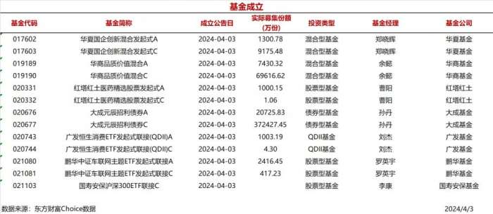 每经AI快讯,据东方财富Choice数据统计,今日共有13只基金公告成立(A/C类分开计算)期货配资炒股,股票型基金5只,混合型基金4只,债券型基金和QDII基金各2只。3只基金实际募集金额破亿份期货配资炒股,其中大成元辰招利债券C实际募集份额最多达37.24亿份。